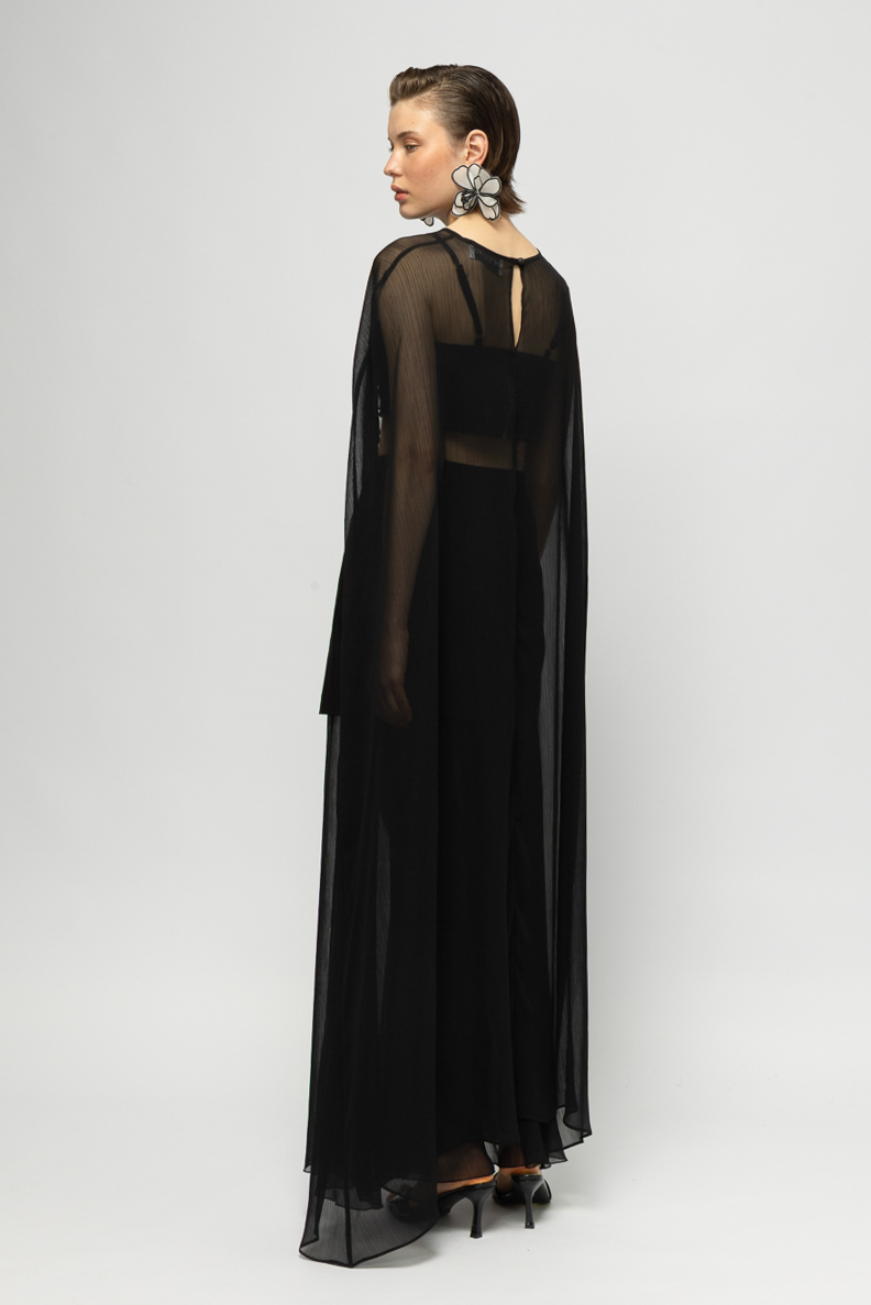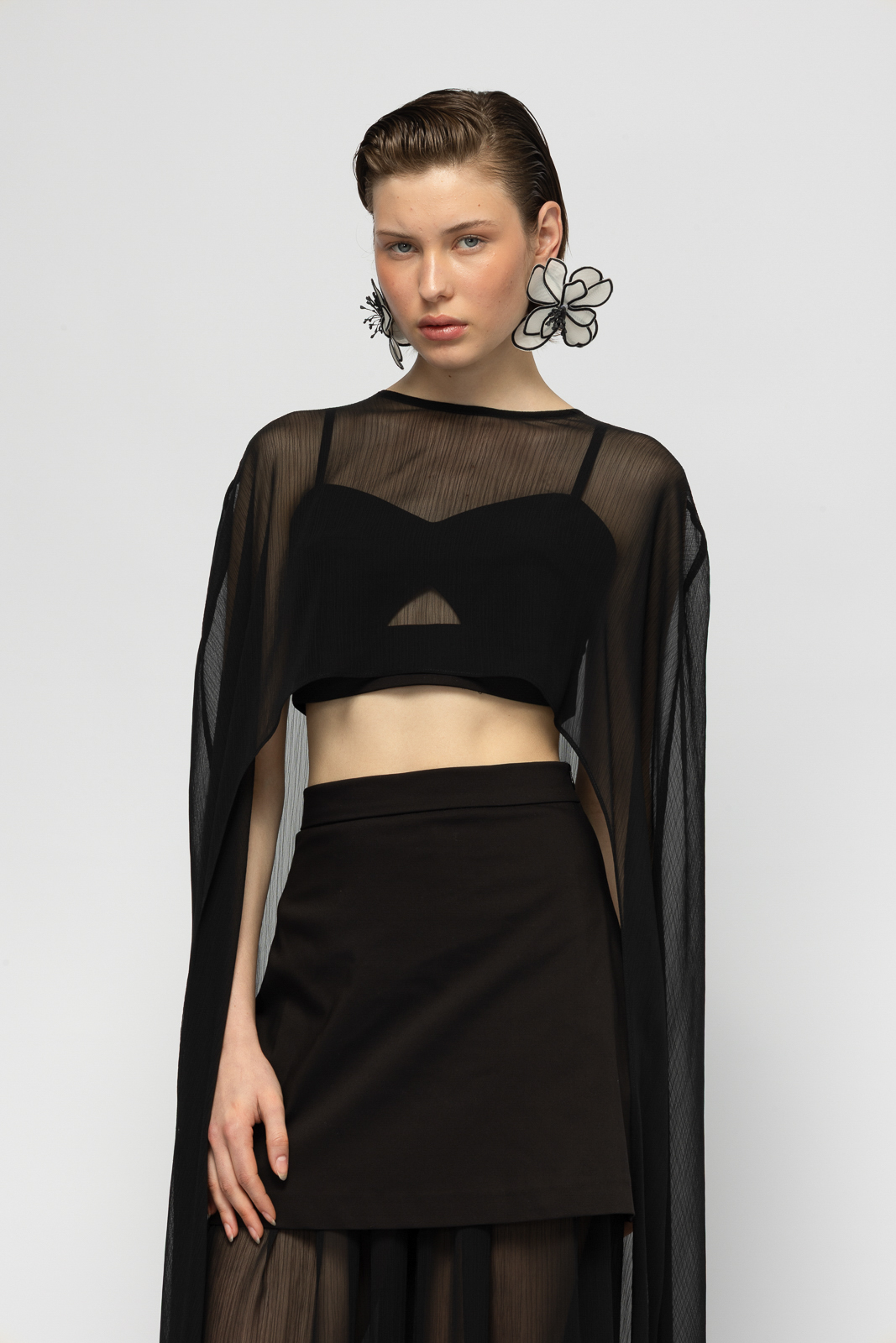Sheer drama. A flowing sheer cape layered over a sleek black set — bold, ethereal, and effortlessly striking.