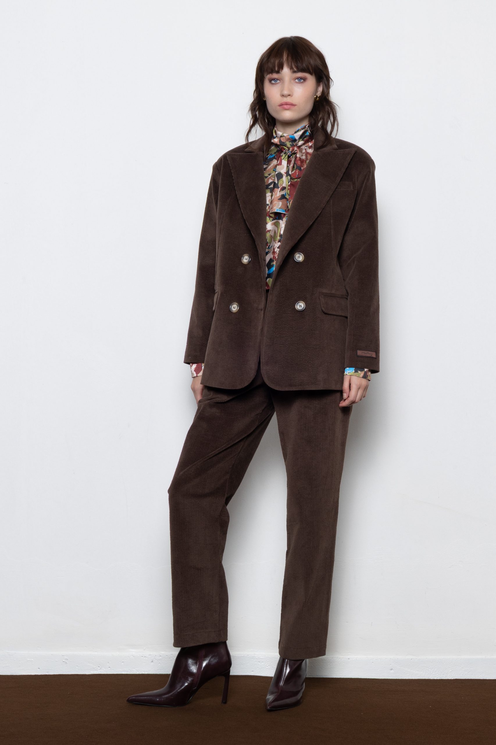 Tailored confidence. This chocolate corduroy blazer features sharp lapels, double-breasted buttons, and a structured fit — a modern classic with vintage soul.