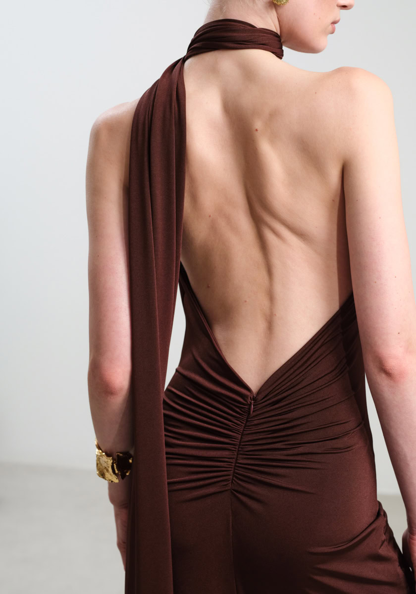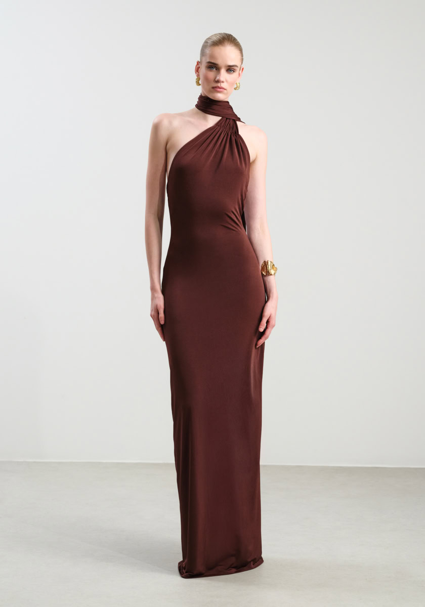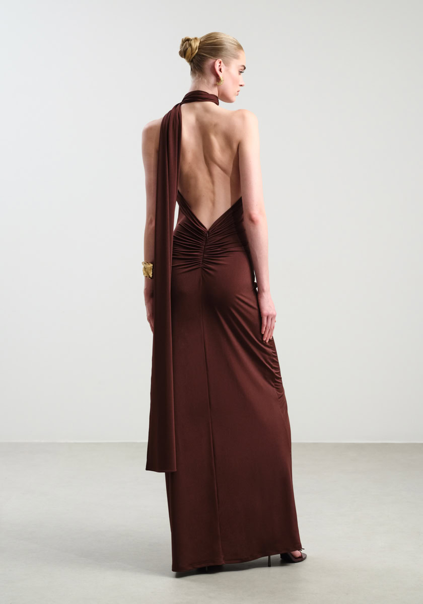 A striking maxi dress crafted from soft stretch jersey that gently hugs the silhouette, creating a flawlessly fitted shape that enhances the natural curves. The halter neckline features delicate gathers that meet at the neck, forming an elegant draped effect that adds distinctive character to the design. The open back introduces a bold yet sensual touch, while the long flowing fabric cascading from the neckline adds graceful movement and a sense of understated luxury. The fitted maxi skirt completes the look with refined elegance, making it an ideal choice for formal evening occasions and special events.