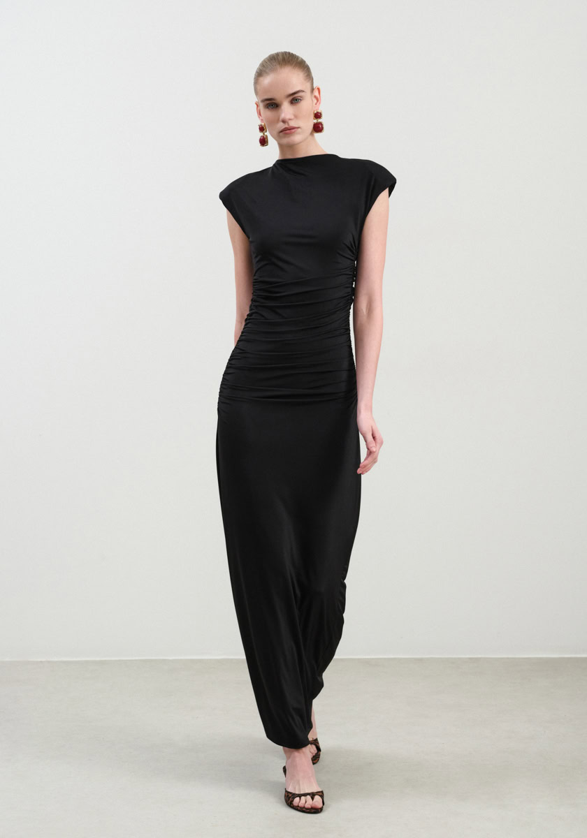 An ankle-length dress crafted from stretch jersey with a fitted silhouette. The design features a high neckline at the front and subtly structured shoulders.