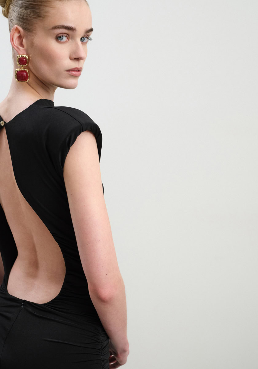 Ruched detailing runs along the body, shaping the fit and defining the silhouette. The back is open with a clean cut and fastening at the upper back.