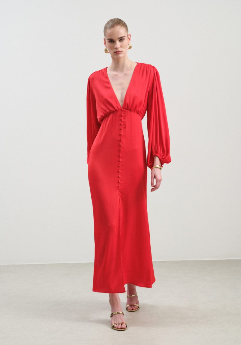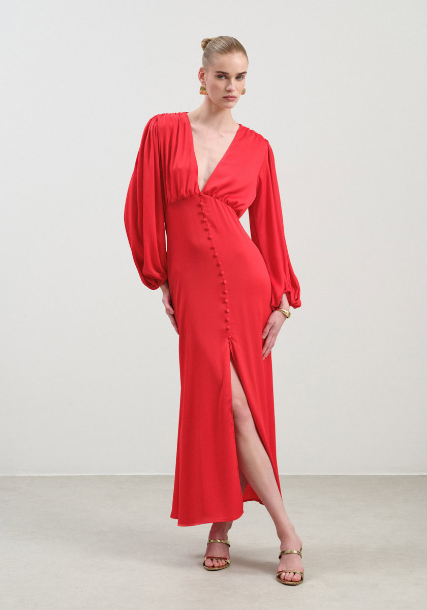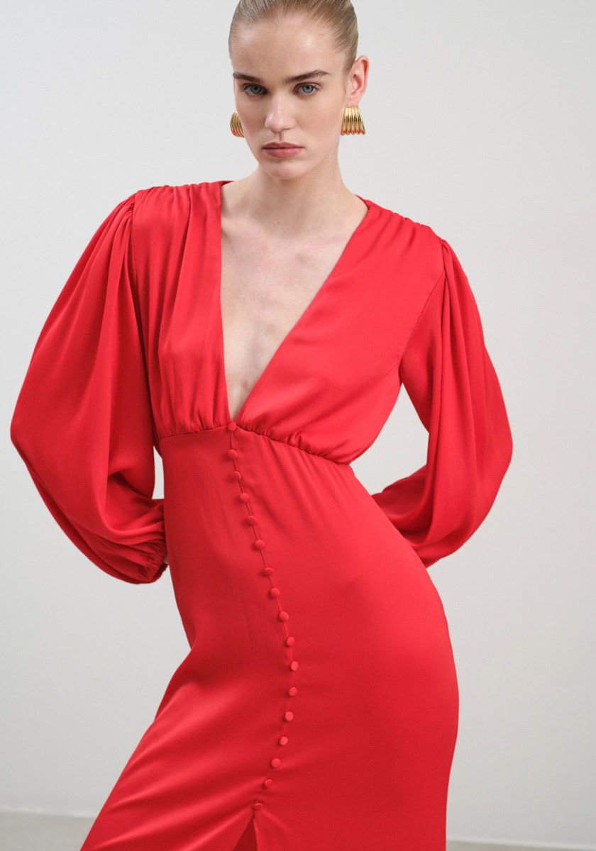 The design features a deep V neckline, long balloon sleeves, and covered buttons running along the front seam.