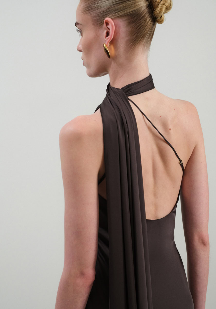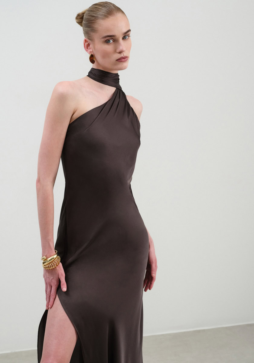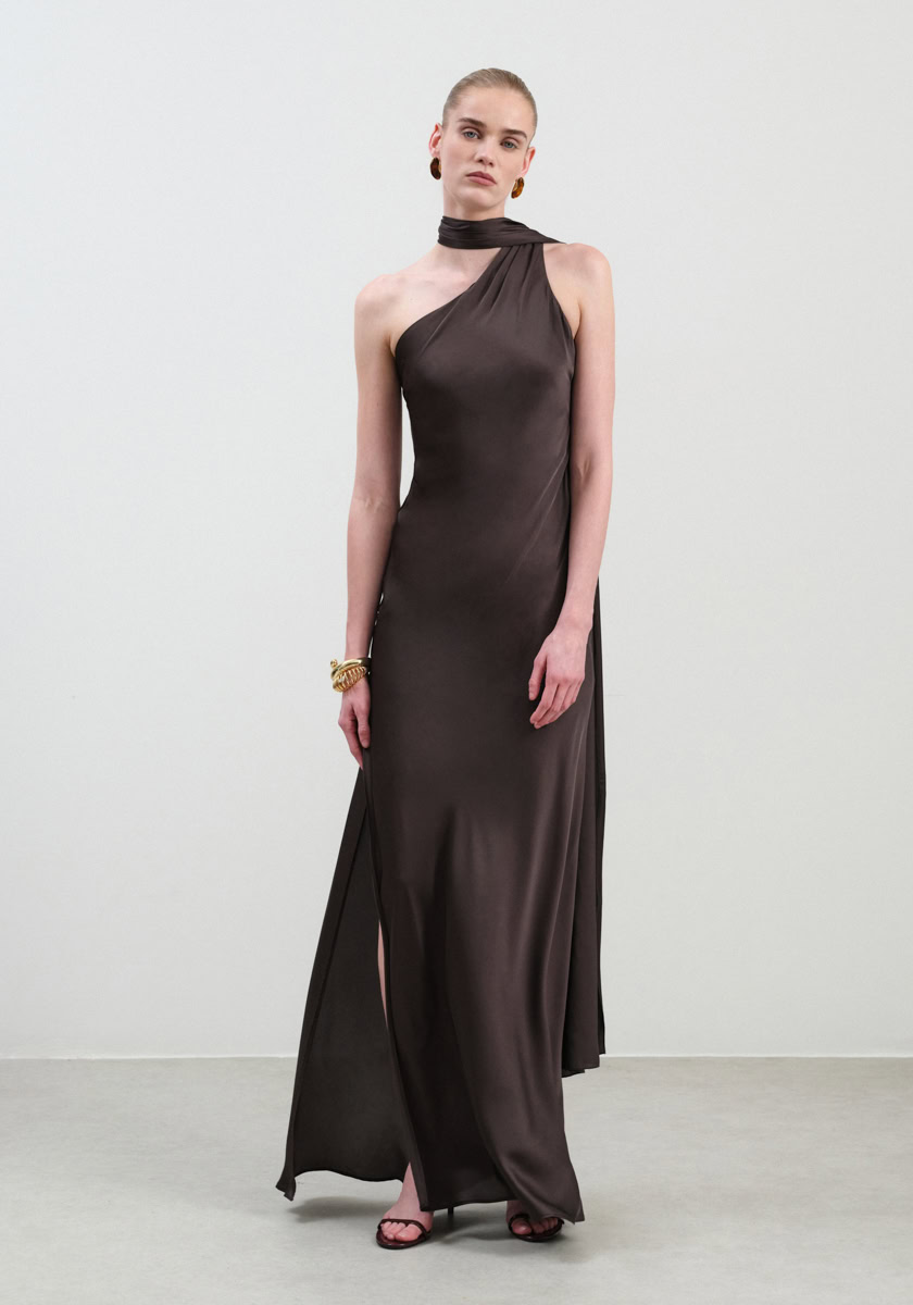 A maxi dress with a one-shoulder, asymmetrical silhouette. Featuring an integrated scarf detail extending from the shoulder, adding movement to the design. The skirt is finished with a side slit, while the back remains open, creating a striking silhouette. Fastens at the side with a zip for a secure fit. Suitable for formal and evening occasions.